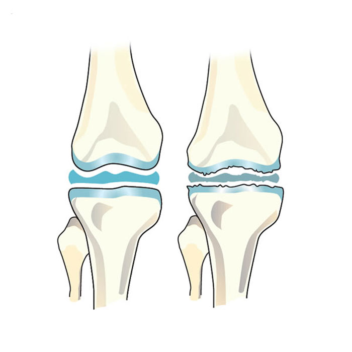 در این عارضه، مقداری از بافت غضروفی استخوانها در محل مفصل زانو تخریب میشود. این اتفاق موجب میشود استخوانها با فاصله کمتری نسبت به یکدیگر در فضایی با حداقل غضروف و حداکثر ساییدگی قرار بگیرند.